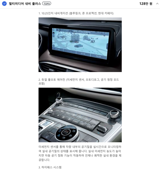 10인치 와이드 내비게이션과 듀얼 풀오토 에어컨, 하이패스가 포함된 옵션입니다.