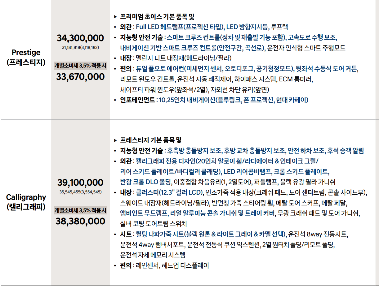 가격은 싼타페 프리미엄은 2975만원부터, 캘리그래피는 3,838만원으로 구성되어 있죠.