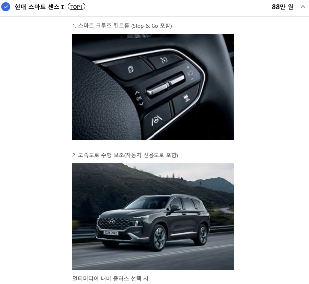 옵션가격이 88만원이지만 이 옵션에는 스마트 크루즈 관련기능(고속도로 주행보조 포함)과 안전사고 방지 기능(후측방 충돌방지보조, 후방 교차 충돌방지, 안전하차 보조)가 포함되어 있습니다.