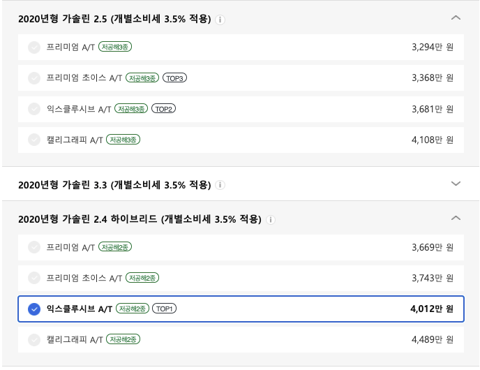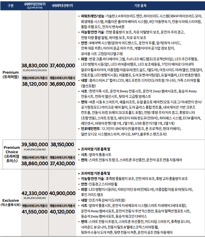 가격표를 보시기 전 앞서 설명했던 연비와 전기모터를 먼저 생각해주세요.