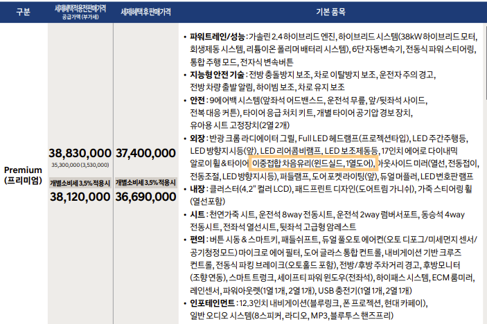 가격표를 보시기 전 앞서 설명했던 연비와 전기모터를 먼저 생각해주세요.