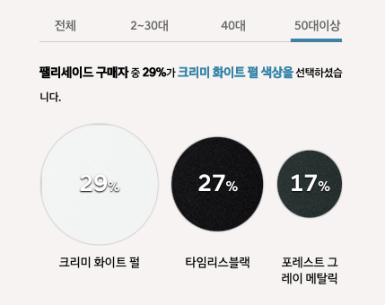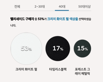 화이트 크리미 펄 선택 비중이 가장 낮고, 타임리스 블랙 선택 비중이 제일 높은 연령층이었습니다.