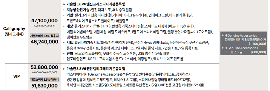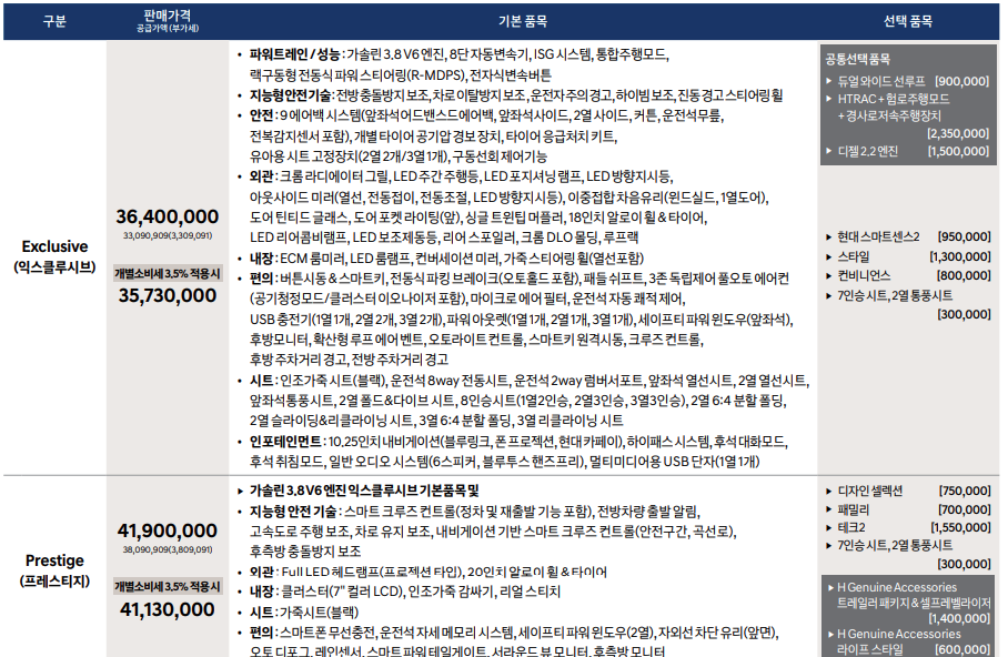 가장 선택을 많이 하는 모델을 꼽으라면 1위 디젤 2.2 프레스티지, 2위 가솔린 3.8 프레스티즈, 3위 가솔린 3.8 캘리그라피입니다.