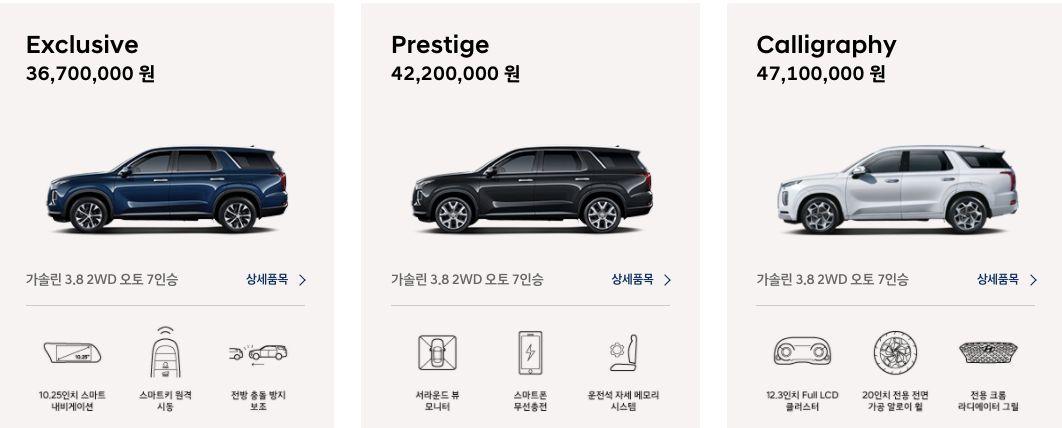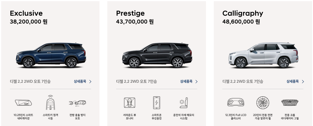 2021 팰리세이드(팰리세이드)는 3가지 등급으로 나뉩니다.