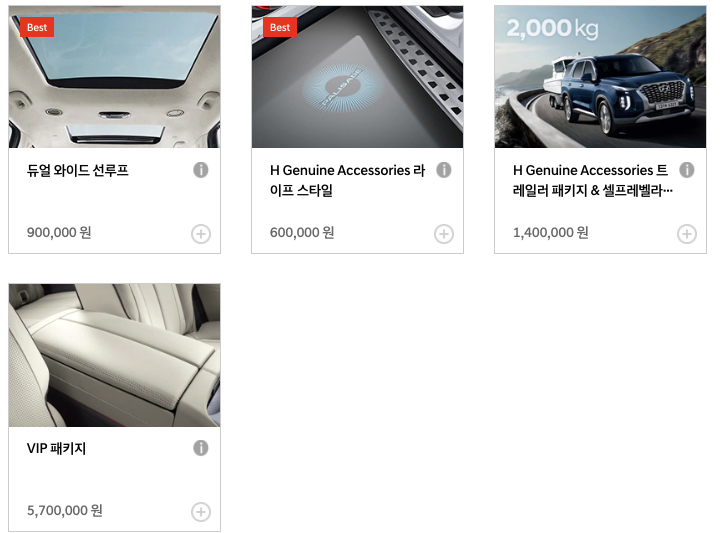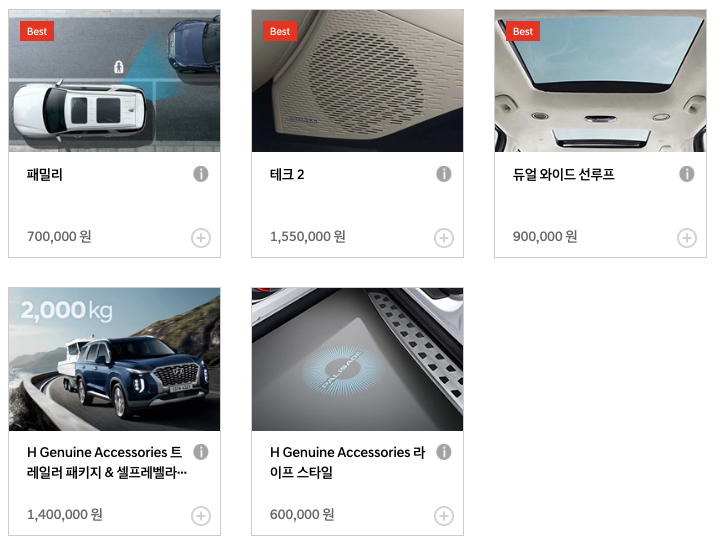 - 패밀리 : 뒷자석 안전과 편리를 위한 옵션으로, 뒷좌석 도어커튼, 안전하차보조, 3열 파워폴딩 시트 등 기능