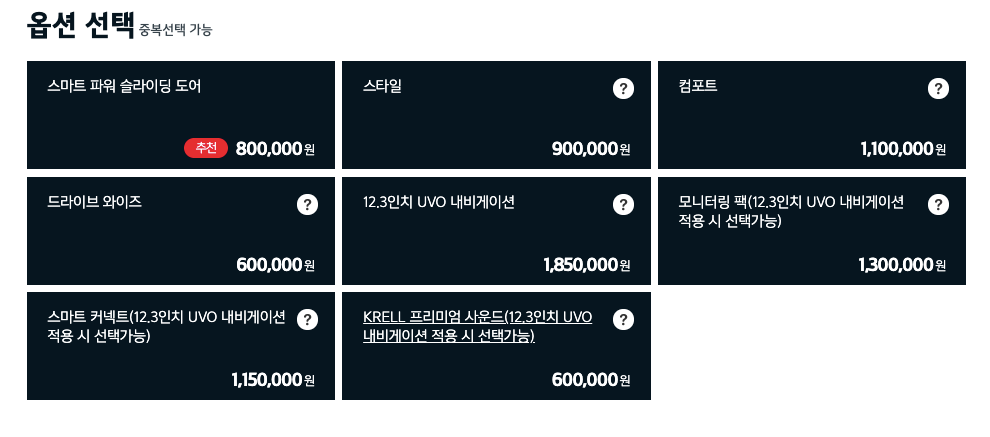 안전을 위한 옵션, 편의를 위한 옵션 등이 있는데, 이 많은 옵션들을 하나씩 추가하고 있자면 가격이 엄청 올라가게 되죠.