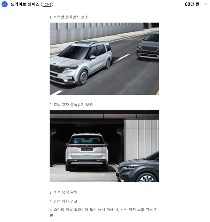 후측방, 후방 교차 충돌방지, 안전하차 경고 등이 있는데, 타 옵션대비 가격이 비싸지 않은 것이라 한 번쯤은 고려하시면 좋을 것 같아요. 특히 이런 안전옵션들은 사고 1번만 막아줘도 옵션값을 뽑는다는 이야기가 있잖아요.