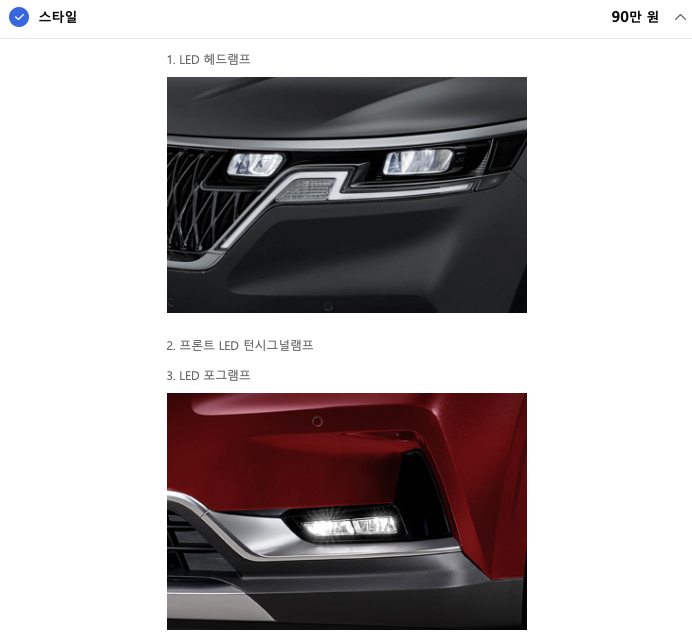 이 옵션을 추가하면 LED 헤드램프를 비롯하여 각종 LED 램프들이 추가되고 19인치 휠이 추가되는 것입니다. 쉽게 말하면 조금 더 예뻐보이는 옵션이라고 생각하면 됩니다.