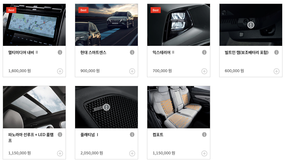 또 쏘나타도 마찬가지입니다. 두번째 등급인 프리미엄부터 선루프가 가능한걸 보면, 옵션 구성은 투싼이 나쁘지 않은 것 같습니다.