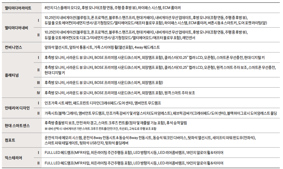 - 플래티넘3 : 후측방 모니터, 서라운드 뷰 모니터, 8 스피커
