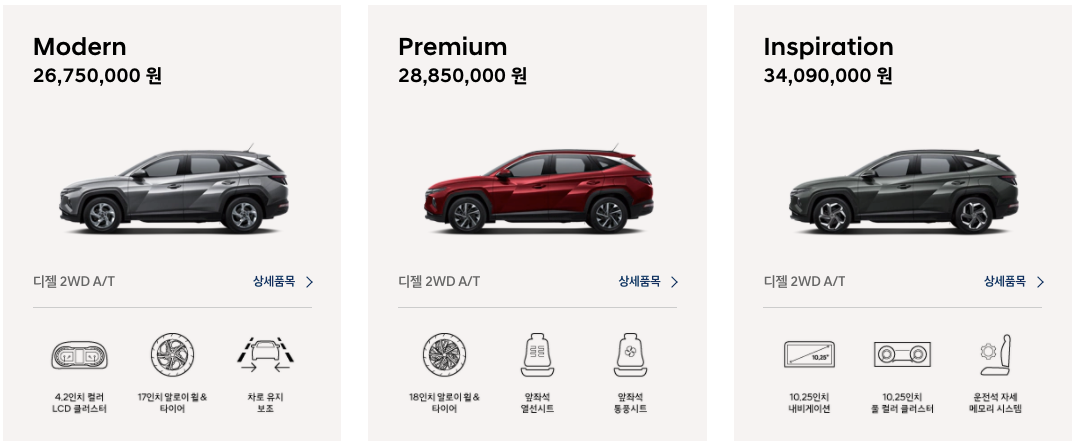 이번에 나온 2021 현대 투싼은 3가지 등급으로 구성됩니다.