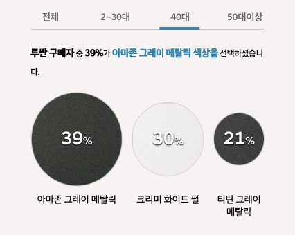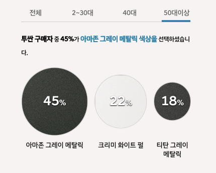 아마존 그레이 메탈릭이 전 연령에서 1위를 차지했고, 크리미 화이트 펄과 티탄 그레이가 2위, 3위를 차지하고 있습니다.