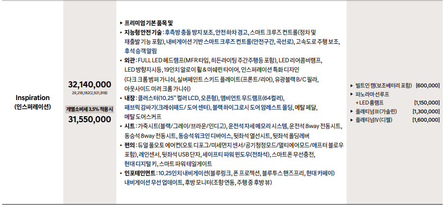 - 컨비니언스 : 앞좌석 열선 시트, 통풍시트, 핸들 열선