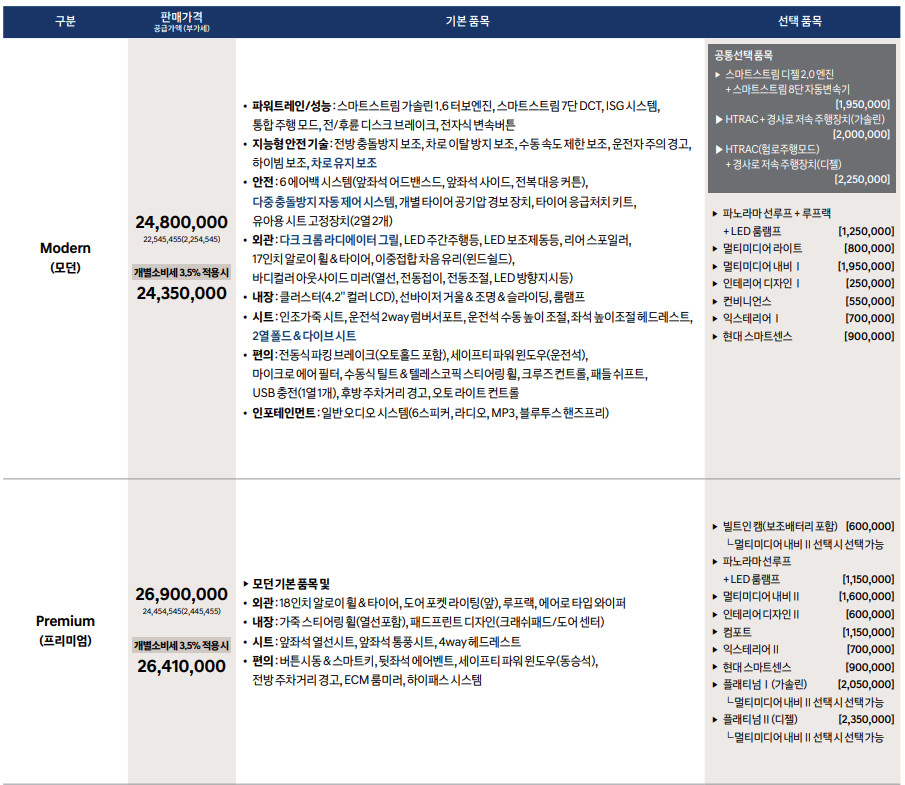 가장 기본 등급인 모던부터 프리미엄, 인스퍼레이션으로 되어 있는데 가장 많이 선택한 등급은 가솔린 1.6 인스퍼레이션 모델입니다.