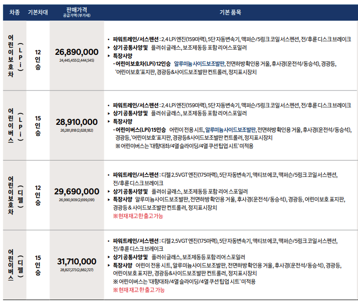 그만큼 많이 이용하기에 어린이 보호차량 전용 모델이 따로 나와있습니다. 이 모델은 사이드 스탭이 기본 장착되어 있고, 어린이 안전을 위한 기능도 포함되어 있습니다.