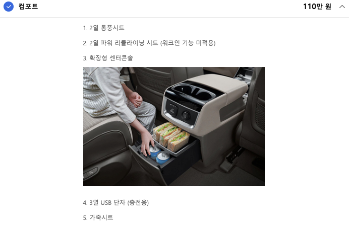 특히 2열 시트를 통풍시트와 리클라이닝 시트 기능을 추가하는 것인데, 이 옵션을 넣으면 장거리 이동시 2열은 정말 편하게 움직일 수 있어요. 가족들의 편안함을 고려한다면 한 번쯤은 고려해보시고, 가성비가 중요하고 4명 이상의 가족들이 탑승하여 3열 시트도 사용해야 된다면 이건 생각해봐야 할 것 같아요.