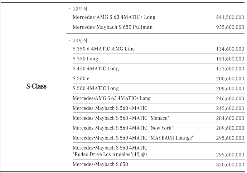 럭셔리 세단의 자존심 또는 벤츠의 얼굴이라고 할 수 있겠죠. 벤츠의 디자인 철학이 가장 많이 반영되고, E클래스보다 비싼 가격이라 쉽게 넘볼 수 없는 차량이기도 합니다. 벤츠 S클래스 중 가장 많이 팔린모델은 S560이며, 벤츠 S클래스 S560 가격은 2억부터 시작합니다.