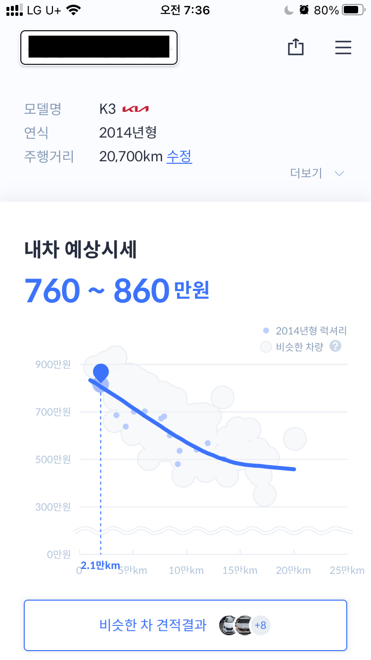 내 차의 예상시세는 760~860만원으로 나왔는데