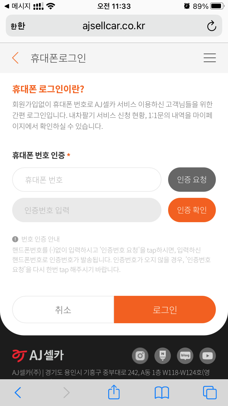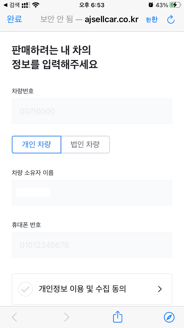 1. 토스 내차 팔기(또는 AJ셀카 사이트 이용)에서 내 정보 입력