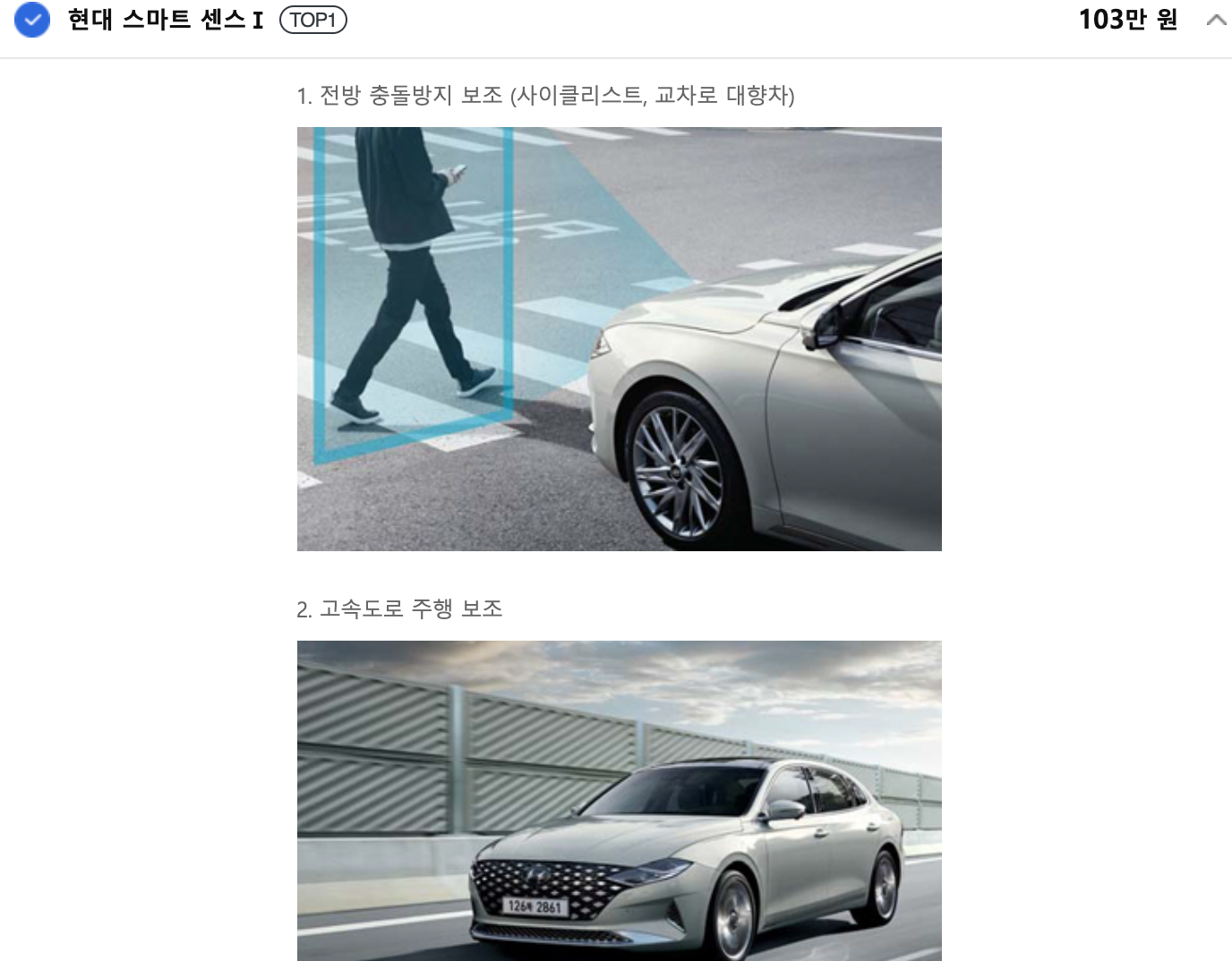 가장 2021 신형 그랜저에서 선택을 많이한 옵션이 바로 현대 스마트 센스1입니다.