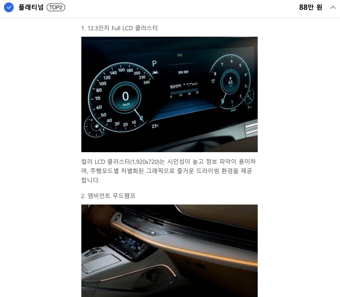 옵션이 늘어나는 만큼 출고가도 영향을 미치고, 또 취득세, 등록세에도 영향을 미치는 만큼 꼭 필요한 옵션만 선택이 필요합니다.