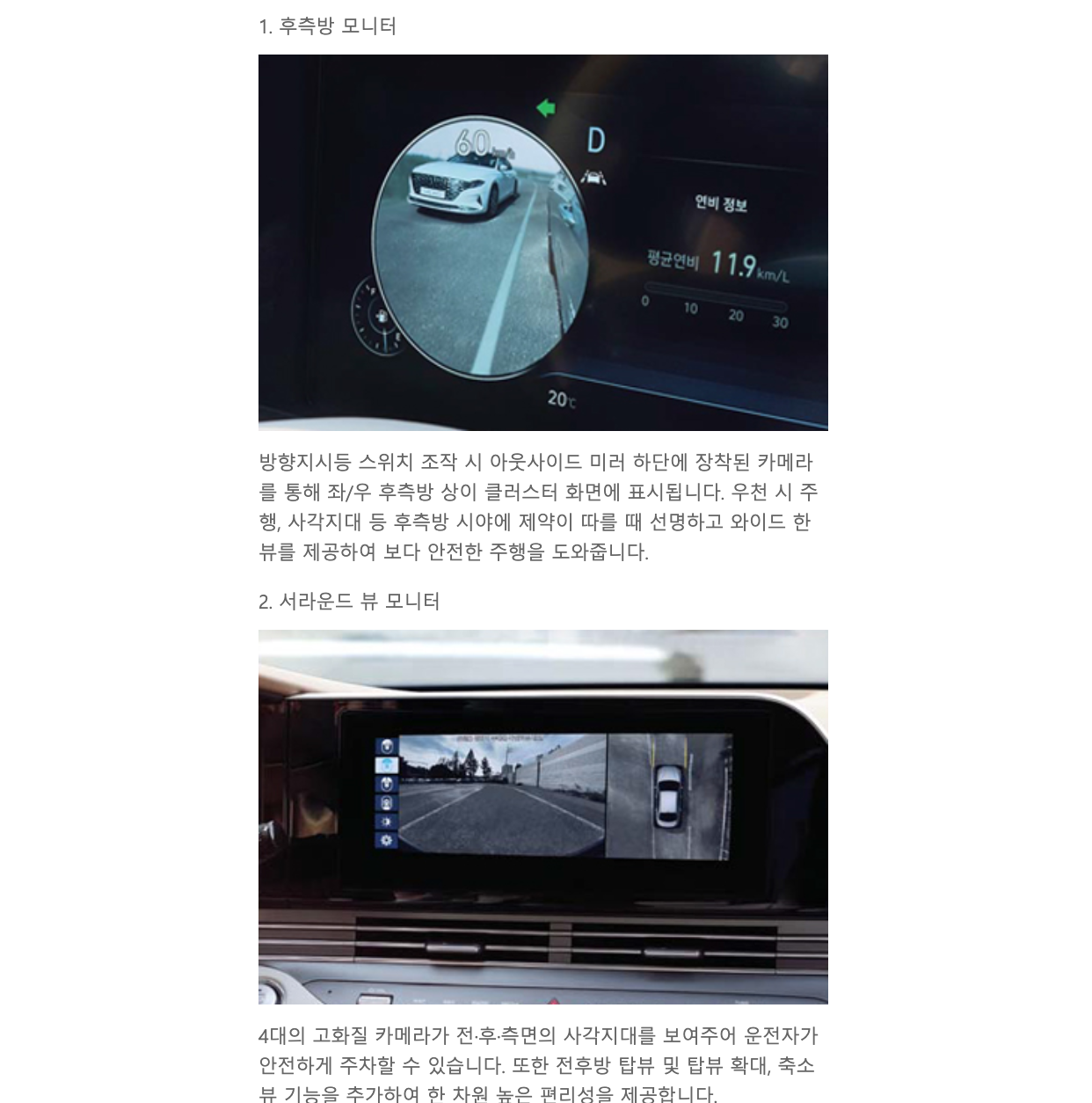 좌/우 차량변경시 후측방 모니터로 사각지대를 비쳐주니깐 편리하고,