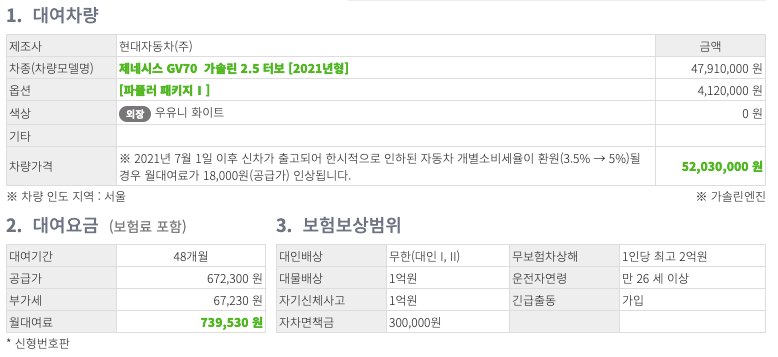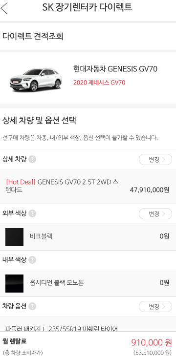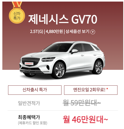 특히나 제네시스 GV70의 경우 타사보다 거의 월 비용이 20 가까이 싸게 나와서 깜짝 놀랬어요.