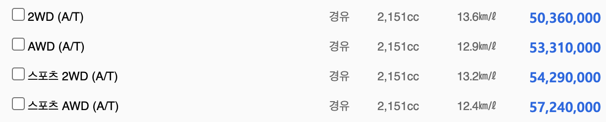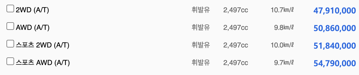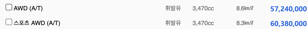 - 복합연비 : 8.3~13.6 ㎞/ℓ