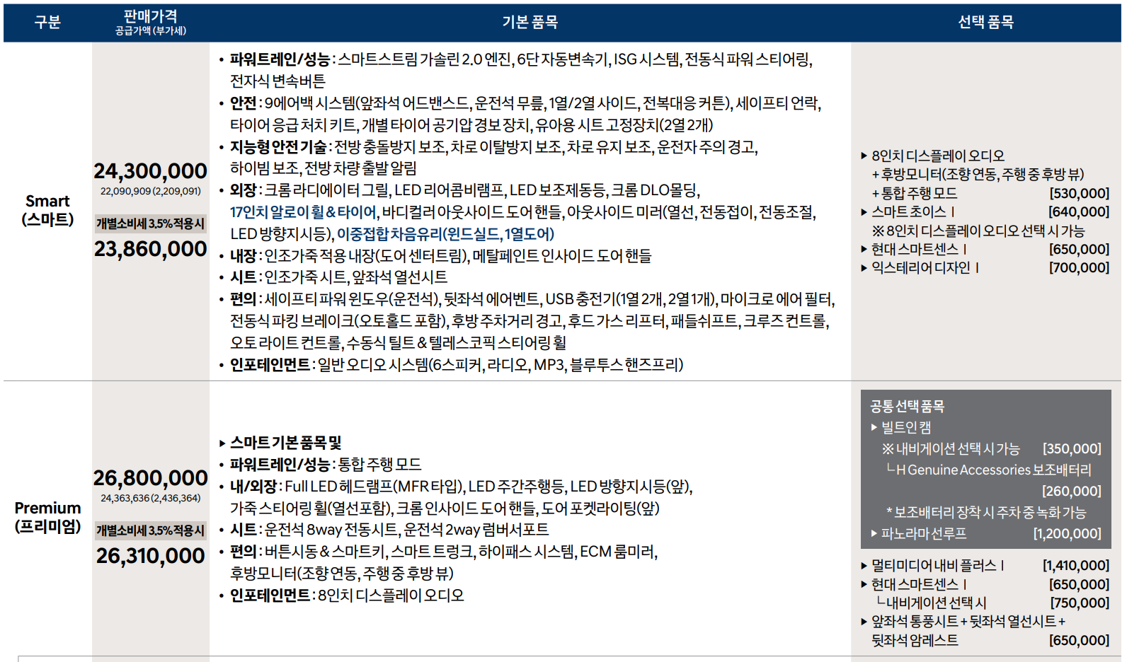 쏘나타 스마트 2386만원, 옵션을 더하니 차가격은 2612만원이 되었습니다.