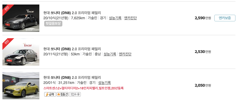 중고차 사이트 엔카, KB차차차 두 곳에서 쏘나타 중고, 그랜저 중고차 가격을 비교해보겠습니다.