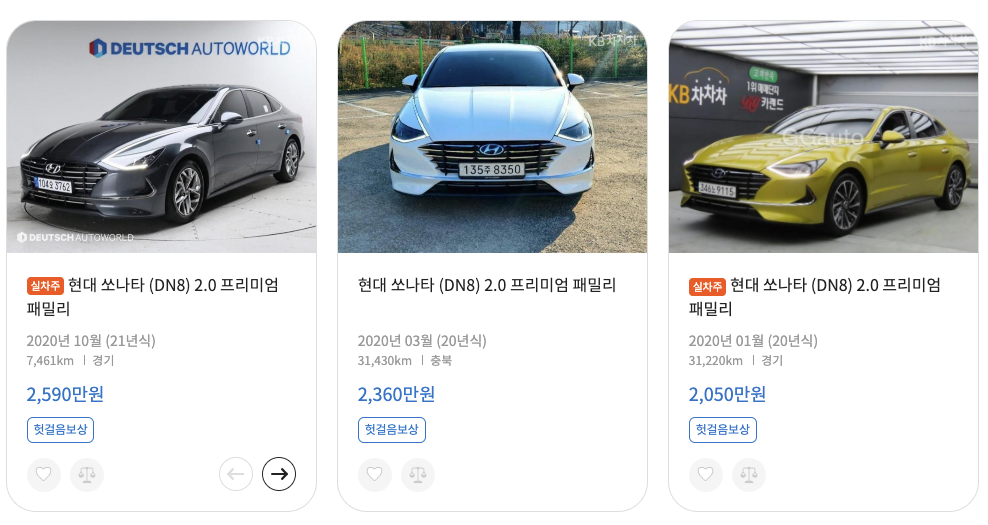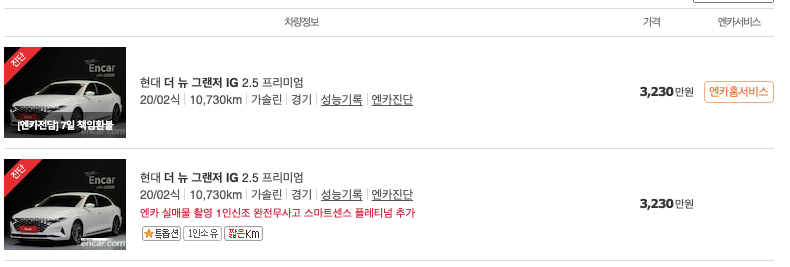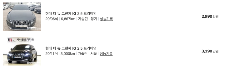 둘다 2020년식 차량을 대상으로 키로수만 조금 다른 조건으로 검색했습니다.