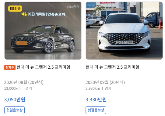 중고차 사이트인 KB차차차도 그랜저와 쏘나타의 가격이 비슷한 상황입니다.
