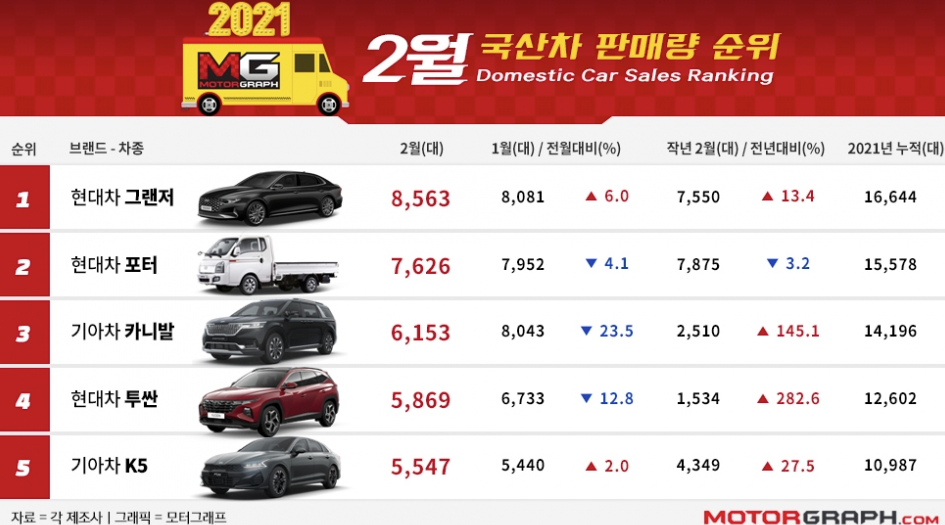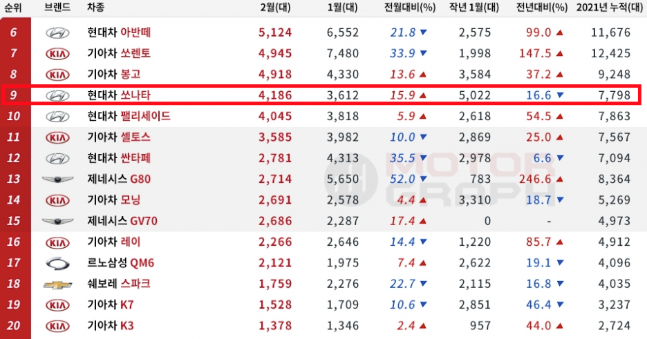 최근 자료인 2021년 2월 국산차 판매량 순위 베스트5에도 쏘나타는 없습니다.