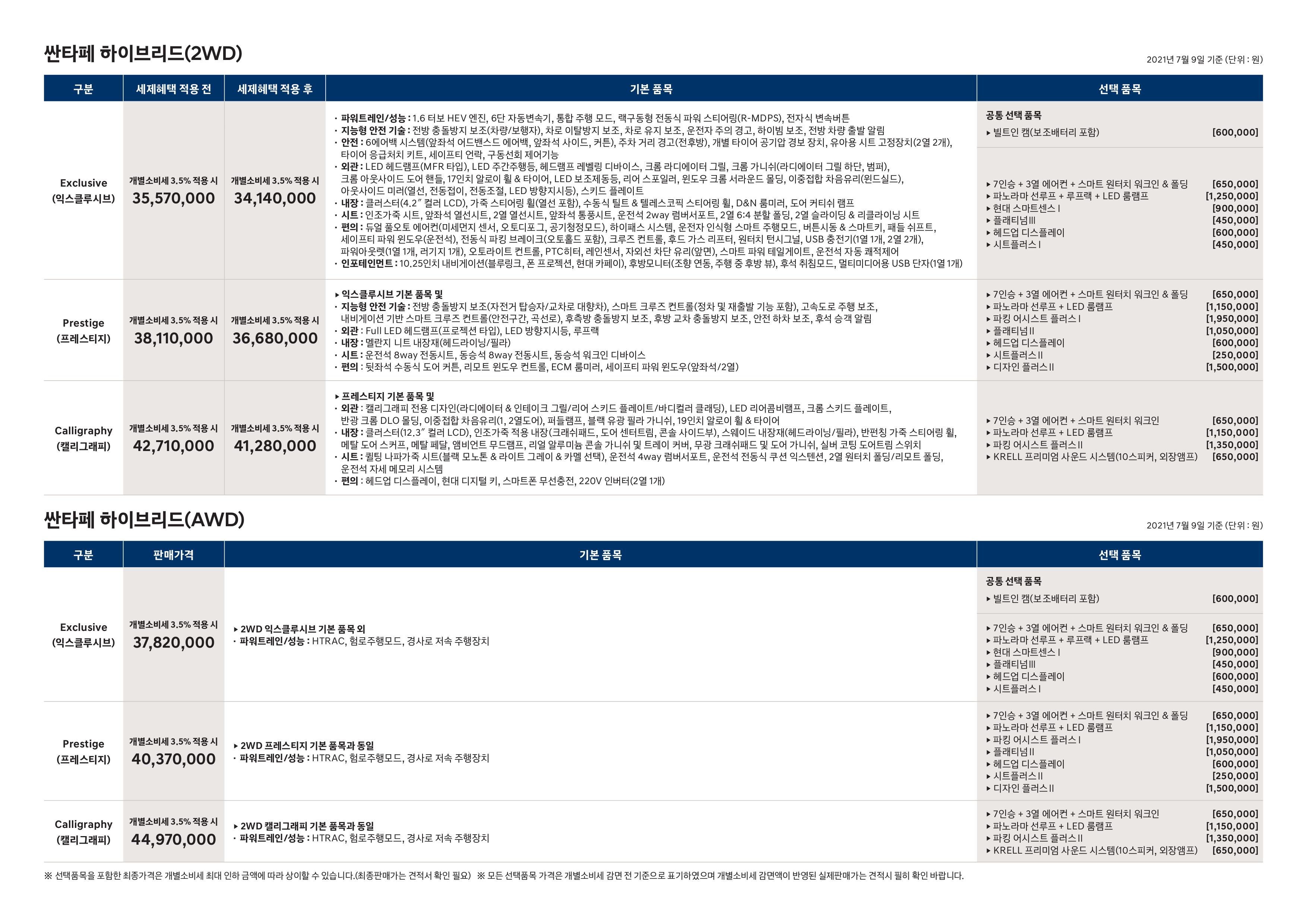 싼타페 하이브리드 가격은 기본 트림인 익스클루시브가 3414만원입니다. 기존 싼타페는 프리미엄 - 프리미엄 초이스 - 프레스티지 - 캘리그래피로 구성되어 있는데, 싼타페 하이브리드는 프리미엄 대신 익스클루시브로 대체되었습니다.