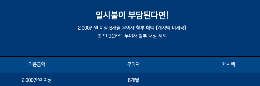 차량 결제금액이 2,000만원이 넘는다면 6개월 무이자 프로모션을 진행하고 있습니다. 캐피탈에 비해서 저렴한 것 하나만으로 꽤 매력이 있죠?