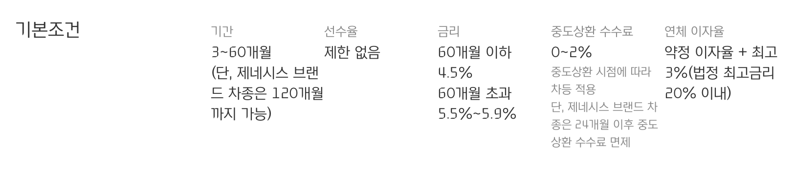 - 선수금 : 제한 없음(단, 선수금이 10% 이하시 금리 할인 미제공)