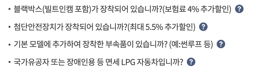 이때 현명한 방법은 블랙박스 가격을 최저한도로 적는 것입니다. 블랙박스는 차량에 부착물로 인식하여 차량 보험료가 상승하게 됩니다. 만약 고가의 블랙박스 가격을 그대로 적는다면 할인율이 생각보다 적을 수 있습니다.