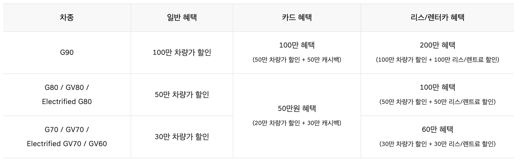 - 리스/렌터카 혜택 : 100만원 혜택(50만원 할인 + 50만원 리스/렌트료 할인)