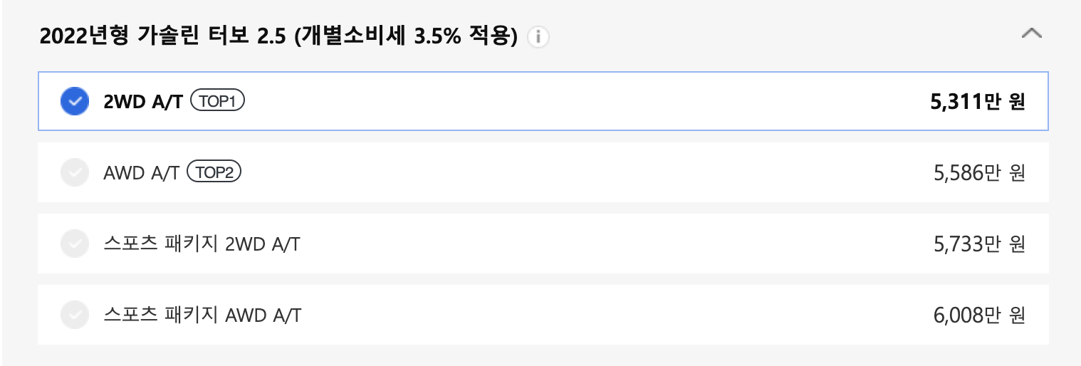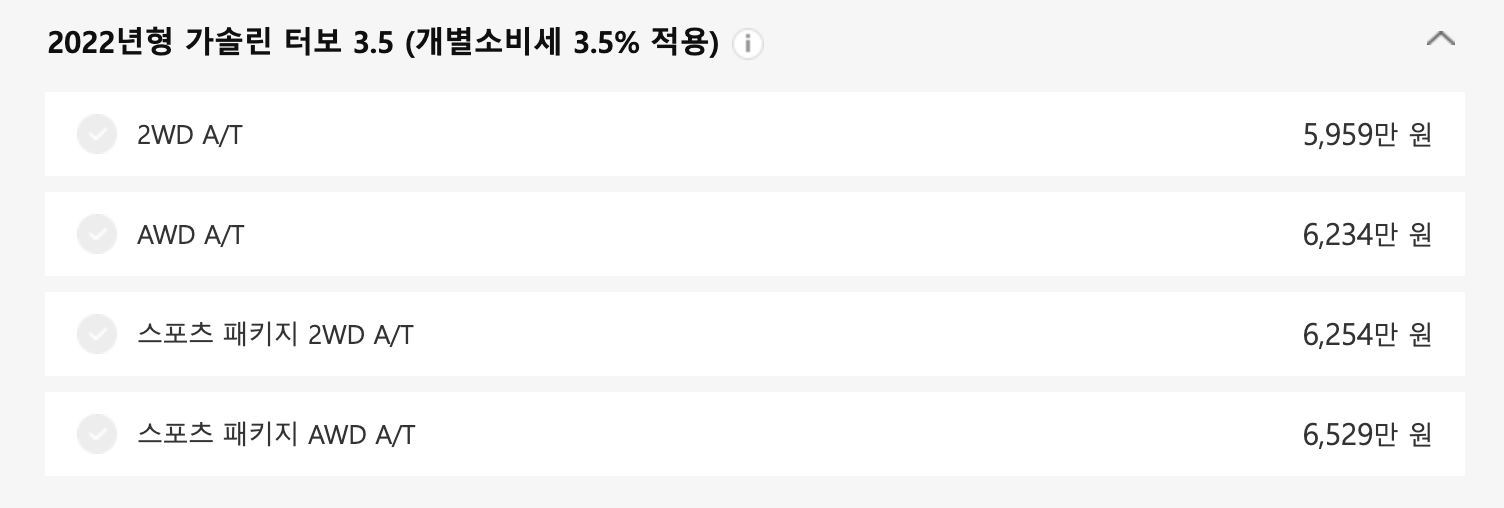 가솔린 2.5 터보로는 순간 가속력 및 드라이빙 성능이 부족한 분들을 위해 가솔린 3.5 터보 모델도 있습니다. 가격은 6000만 원부터 시작됩니다.